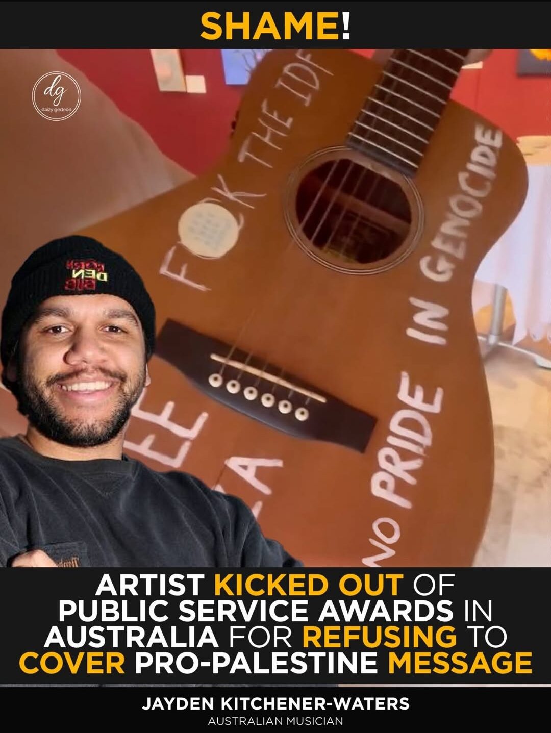 Tonight I was invited to sing at NSW Parliament House for the NSW Premier’s Public Service Awards. After I arrived, I was told I could not perform because of the messages on my guitar. Apparently they were “too political” for Parliament House because they “can’t be seen choosing sides”. I asked if they wanted me to fully cross out the word fuck (something I would’ve done) but they also had an issue with the “no pride in genocide” message. As an alternative, they offered to tape over the messages so they wouldn’t be seen. I declined and left. As I was leaving, I asked a staff member “do you support genocide?” to which she responded “no, not really”. not really??? Could you imagine asking someone if they support genocide and they respond with “not really”. Now imagine they work at our States Parliament. How embarrassing.